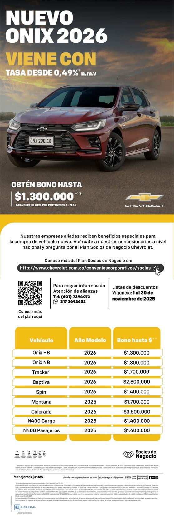 Visita los concesionarios de la red Socios de Negocio Chevrolet y cotiza el carro que deseas adquirir. Debes presentar tu certificado de asociado para que se aplique el descuento.